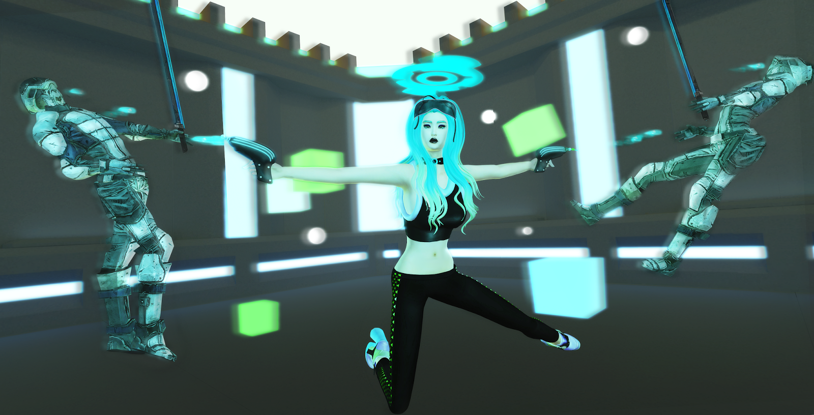 For my top i'm wearing AsteroidBox's Space Invader crop shirt with Razor///'s awesome studded leggings. This top is available in various other pastel colors as well. To defend myself I'm wearing another of AsteroidBox's items at Comic Con, which are these cute but deadly ray guns! (Only accessory no animations).